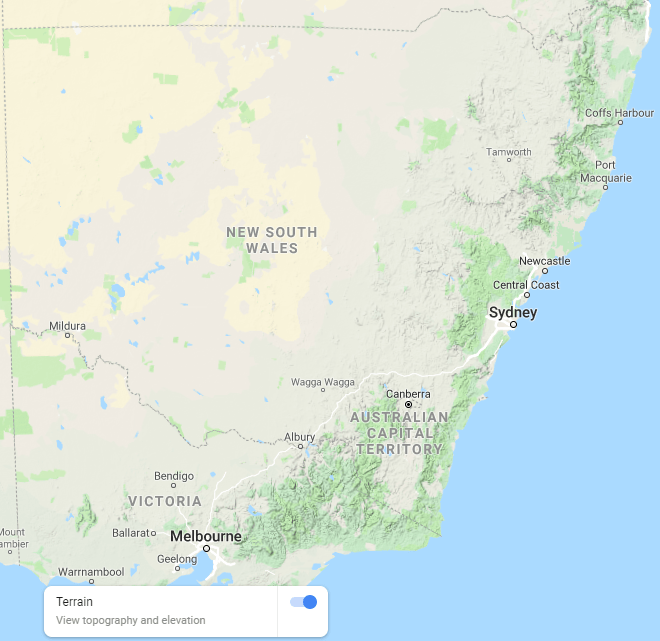 The sections on this map that are lighter brown indicate the high lands or ranges of the Australian landscape. The lower points are represented via the darkening shades of green. In reality though the inland of Australia is mostly desert sand in colour.