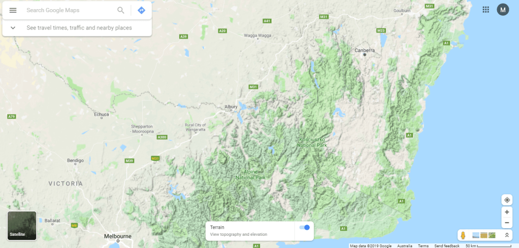 The great dividing range is not just one long mountain with a continuous top, instead it has a mix of peaks with valleys between them. In some places the terrain is relatively flat, consisting of very low hills. Typically the highlands range from 300 to 1,600 metres in height. Albury is a lowly 165 m above sea level. The table below shows the continuous decent from Mt Kosciuszuko towards the end of the river in Goolwa, South Australia.